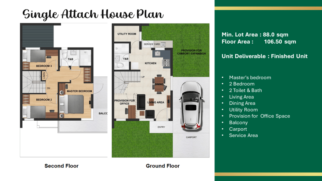 - Three-bedroom single attached units in modern Asian architecture. Available in two color schemes and facades.